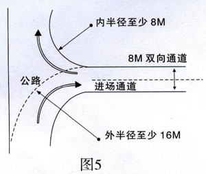 ●進(jìn)廠通道直角轉(zhuǎn)彎處,內(nèi)半徑應(yīng)至少8米, 外半徑應(yīng)至少16米(圖5)。