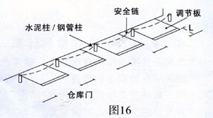 ●設(shè)計開放式平臺時注意在建筑物墻壁與高度調(diào)節(jié)板之間,需有足夠空間深度(L至少4.5米)供叉車轉(zhuǎn)彎調(diào)動用(須考慮雙向叉車行走情況)。如此深度不足4米,則每臺調(diào)節(jié)板需正面對應(yīng)倉庫門,搬運車輛直進直退上下貨。同時,有必要在平臺邊緣設(shè)置水泥柱、安全鏈或其它類似障礙物以減少叉車掉下平臺的危險(圖16)。
