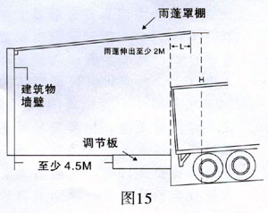 雨蓬前端伸出貨臺外沿要求在2米以上(L),以免裝卸貨因風(fēng)雨天氣而無法運作,這里的H與L值成正比,即H越高,L則越長,以減少雨水浸入。(圖15)