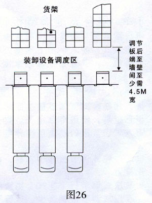平臺(tái)內(nèi)部必須安全高效,為避免危險(xiǎn)和交通阻塞,必須有足夠的空間以利叉車轉(zhuǎn)彎調(diào)動(dòng)。由調(diào)節(jié)板后端至墻壁(或大門/電梯)至少需4.5米寬且無阻擋視線的障礙物,足夠允許兩輛叉車對(duì)開。