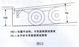 如平臺前的裝卸區(qū)有下挖的坡度,則需適當(dāng)降低平臺高度(圖22)。這一坡度會使貨車底板高度降低最高達(dá)20厘米,即HL值肯定大于HD值。